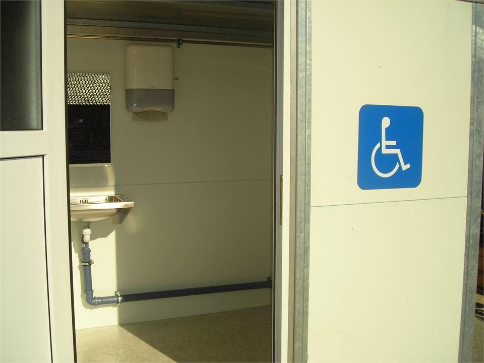 Unser rollstuhlgerechtes Behinderten-WC mit Auffahrrampe in den Maßen 1,70 m (Breite) x 2,15 m (Länge) x 2,20 m (Höhe) verfügt über eine Toilette, ein Waschbecken und ein Pissoir. Wie beim Pissoir-Container benötigt man für den Betrieb einen 220 V Stromanschluss.