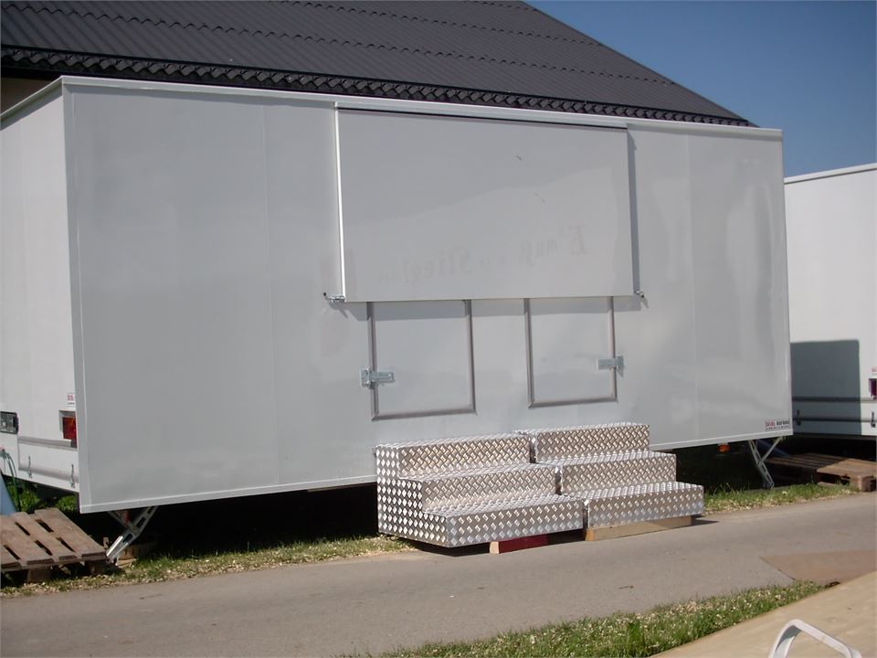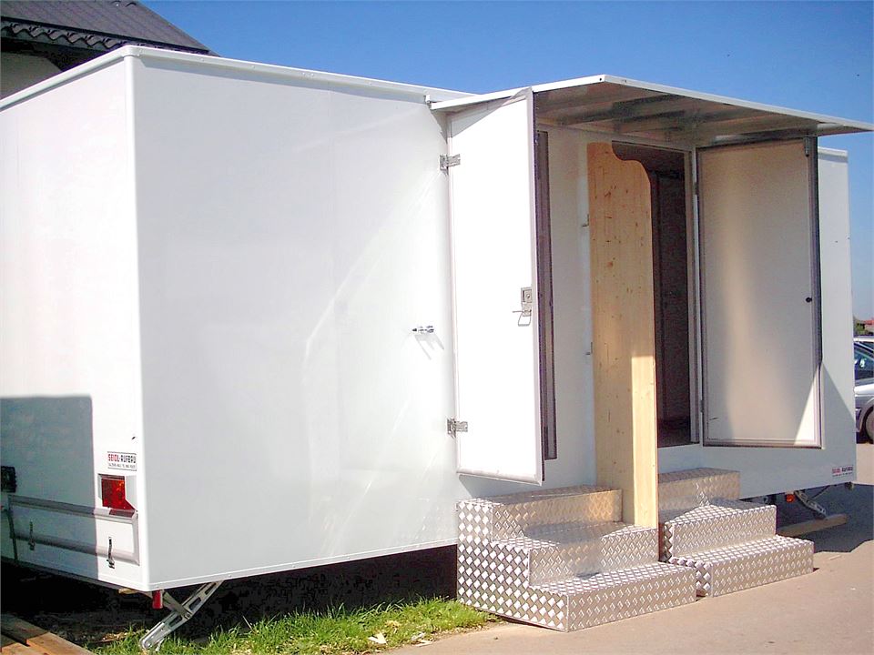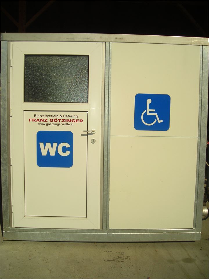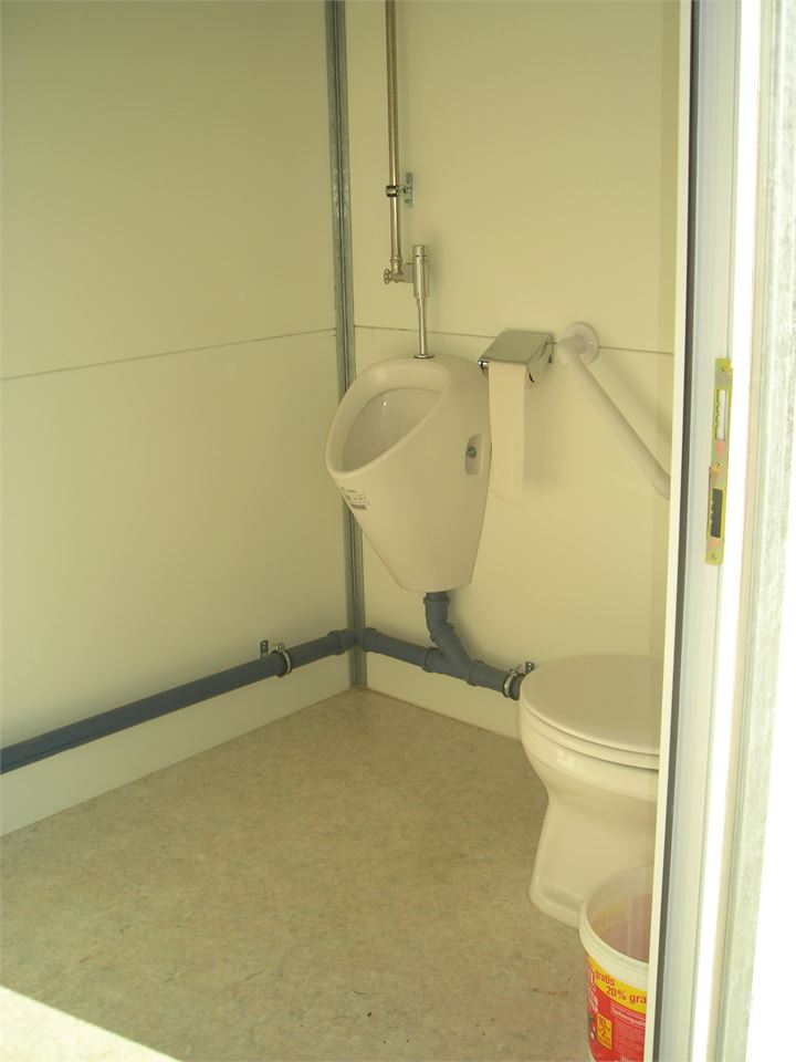 Um den strengen behördlichen Auflagen Rechnung zu tragen, bieten wir auch ein eigenes Personal-WC an. Es ist 1,20 m breit, 1,70 m lang und 2,20 m hoch und verfügt über eine Toilette, ein Waschbecken und ein Pissoir. Betrieb mit 220 V Stromanschluss.